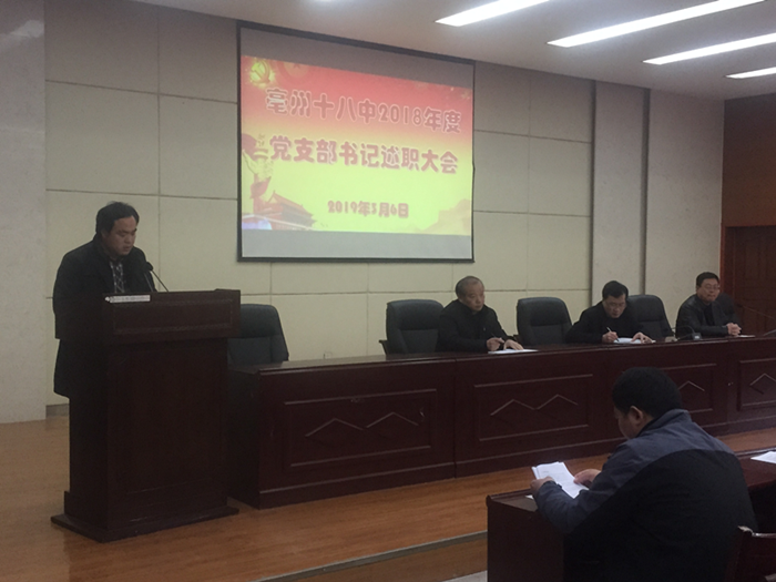 3月6日下午,亳州十八中党总支召开了2018年度支部书记抓党建述职评议会,第二支部书记张震从四个方面进行了述职。