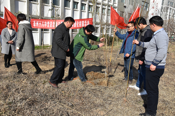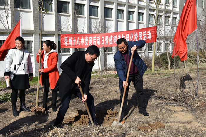 3月12日,第41个全民义务植树节,亳州十八中组织全体党员开展“党员活动日暨植树造林绿化校园活动”。党总支书记、校长吴辉,党总支副书记、副校长孙德兴出席会议,党总支副书记、督导室主任郭飞峰等班子成员参加活动。