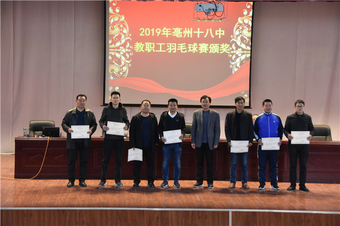 4月1日,亳州十八中在校至美厅举行教职工羽毛球比赛颁奖仪式。