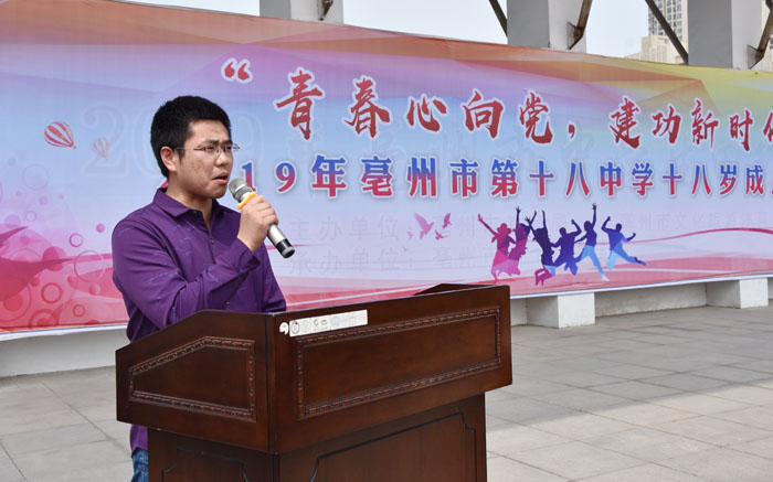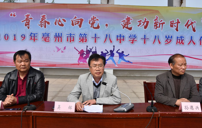 亳州十八中党总支书记、校长吴辉为学生送上成人寄语。吴辉对即将成为共和国最年轻公民的同学们表示热烈祝贺,他期望同学们能够做一个担当责任的人,心中有国家、有民族、有亲朋、有师长;做一个人品高尚的人,把人做正,把事做好;做一个拼搏奋斗的人,沉默、隐忍、吃苦、拼搏;做一个心怀感恩的人,人因感恩而高尚,因感恩而伟大。