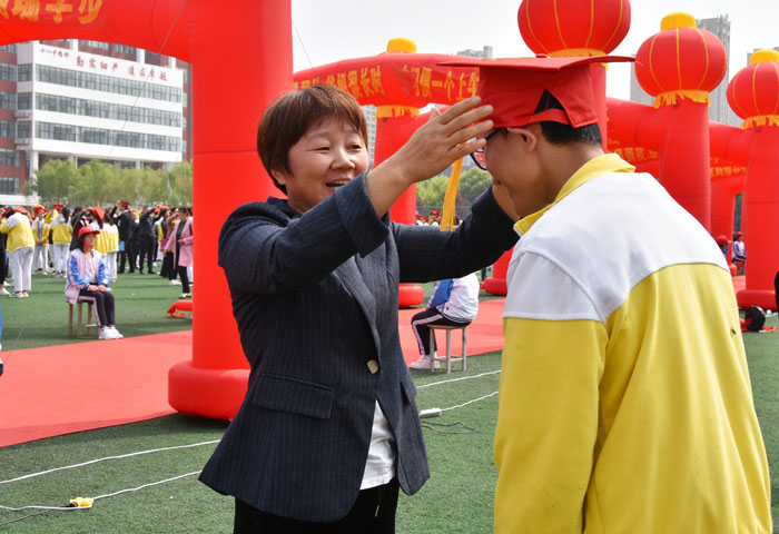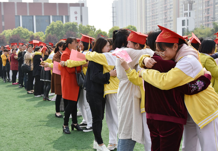 家长为学生冠戴成人帽,学生面向家长以90度的姿态鞠躬三次行拜谢礼,感谢养育之恩,并与家长深情拥抱,大声说出“我爱你们”,许多家长热泪盈眶,场面温馨感人。