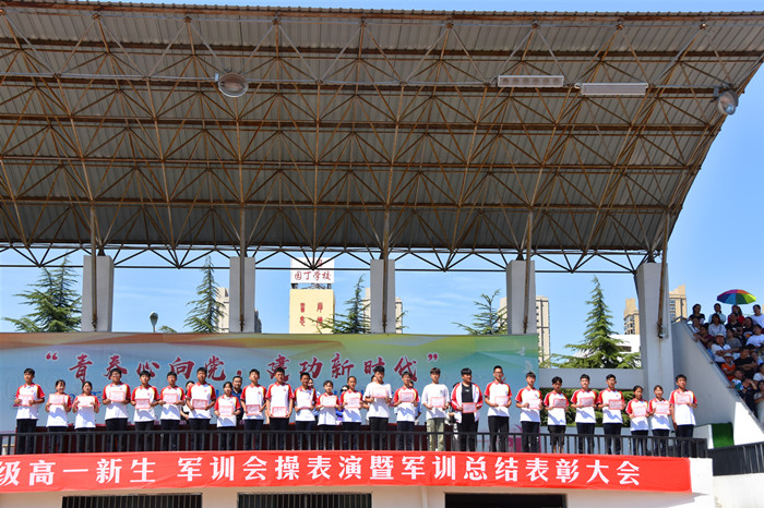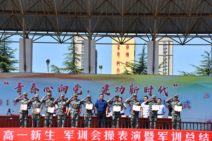 会操表演后,政教处主任何立宏宣读军训标兵名单和优秀班级,校领导依次为获奖教官、获奖班级、获奖学生颁奖。新生代表高一(1)班徐朝阳在发言中,分享了军训的感悟和收获,表达了对教官的感谢,表示在以后的学习中将继续发扬军训期间所练就的意志和吃苦耐劳的精神。
