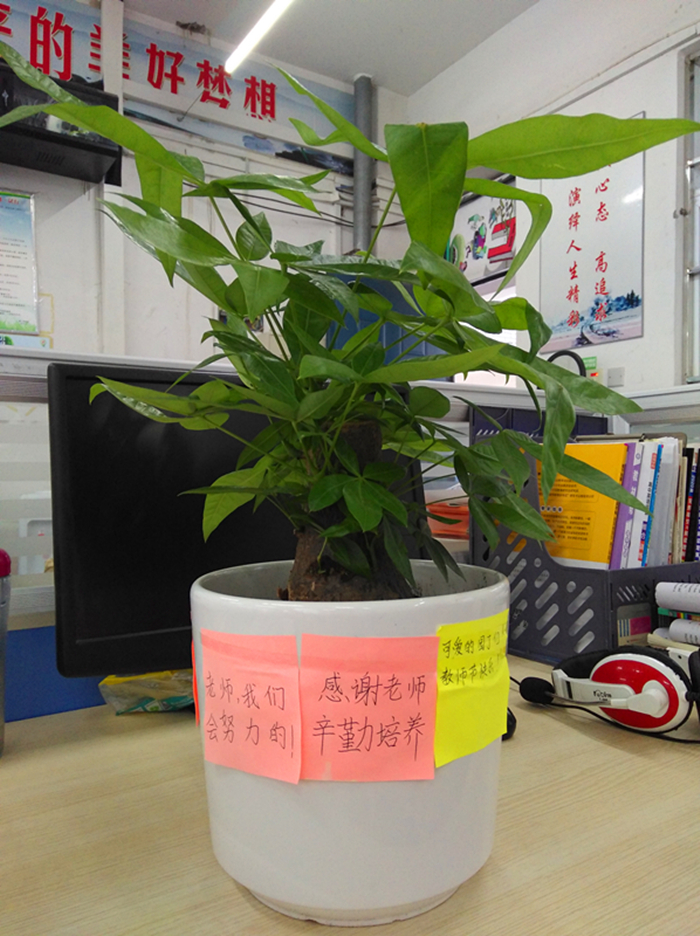 我校教师以高度的责任感投入到每天的教学工作中,或风趣幽默,或管理严格,无论哪一种风格,都是真心为了学生。无私的付出不仅取得了丰硕的成果,同时也获得了丰厚的回报。在这个属于老师们的节日里,“老师辛苦了!”“老师节日快乐!”一声声真诚而热烈的祝福充满校园,表达着学生们对老师的敬爱与感激。一束鲜花、一盆绿植、一个纸条,都凝聚着学生对老师的感恩之心。