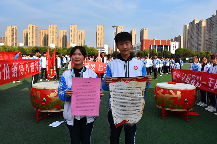 各个班级学生在牛超群的组织下依次成对站列,各班学生代表逐个代表班级宣读了挑战书和应战书,并带领全班同学激情澎湃地喊出各自的挑战口号。