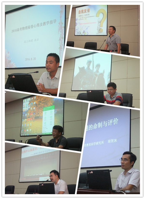培训按照校教科研中心周密安排,分别进行了校长助理孙德兴带领全体教师学习最新职称评审文件,副校长、省特级教师梁彩霞主讲特级教师成长之路,孟键等三位参加高考阅卷的教师汇报阅卷心得,市教科所教研员胡贺冰“课题与命题”讲座,市教科所所长刘光杰“课堂改革漫谈”讲座,校教科研中心副主任高楠“我校的翻转课堂之路”讲座,优秀班主任何立宏、于亚彬班主任工作经验交流,各学科组集体备课等活动。