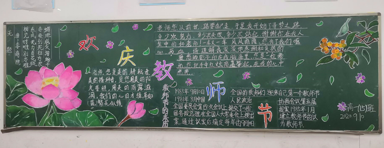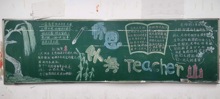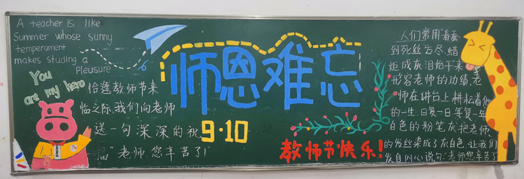 同学们怀着对老师的崇高敬意,发挥聪明才智,各显所能,办出了让老师们感动的黑板报。一幅幅板报排版布局灵活,绘画精美,画面生动活泼,字里行间无不透露出对老师的崇敬与爱戴。黑板报向大家展示了“教师节的来源”“我身边的优秀教师”“感谢师恩”等内容。同学们用朴实无华的词汇,表达了自己对老师们深深的感激之情。同时大家也在黑板报中表示他们将不辜负师恩,勤奋学习,以优异的成绩回报老师的辛勤付出!
