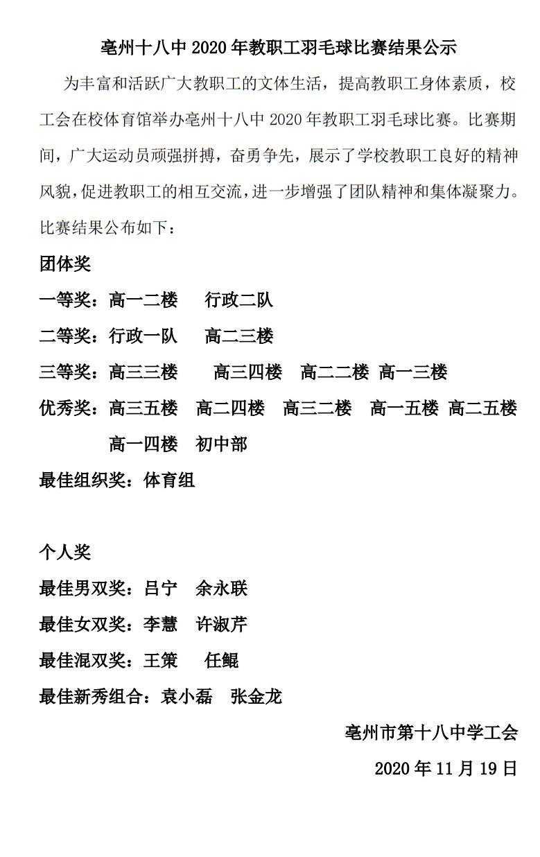 亳州十八中2020年教职工羽毛球比赛结果公示