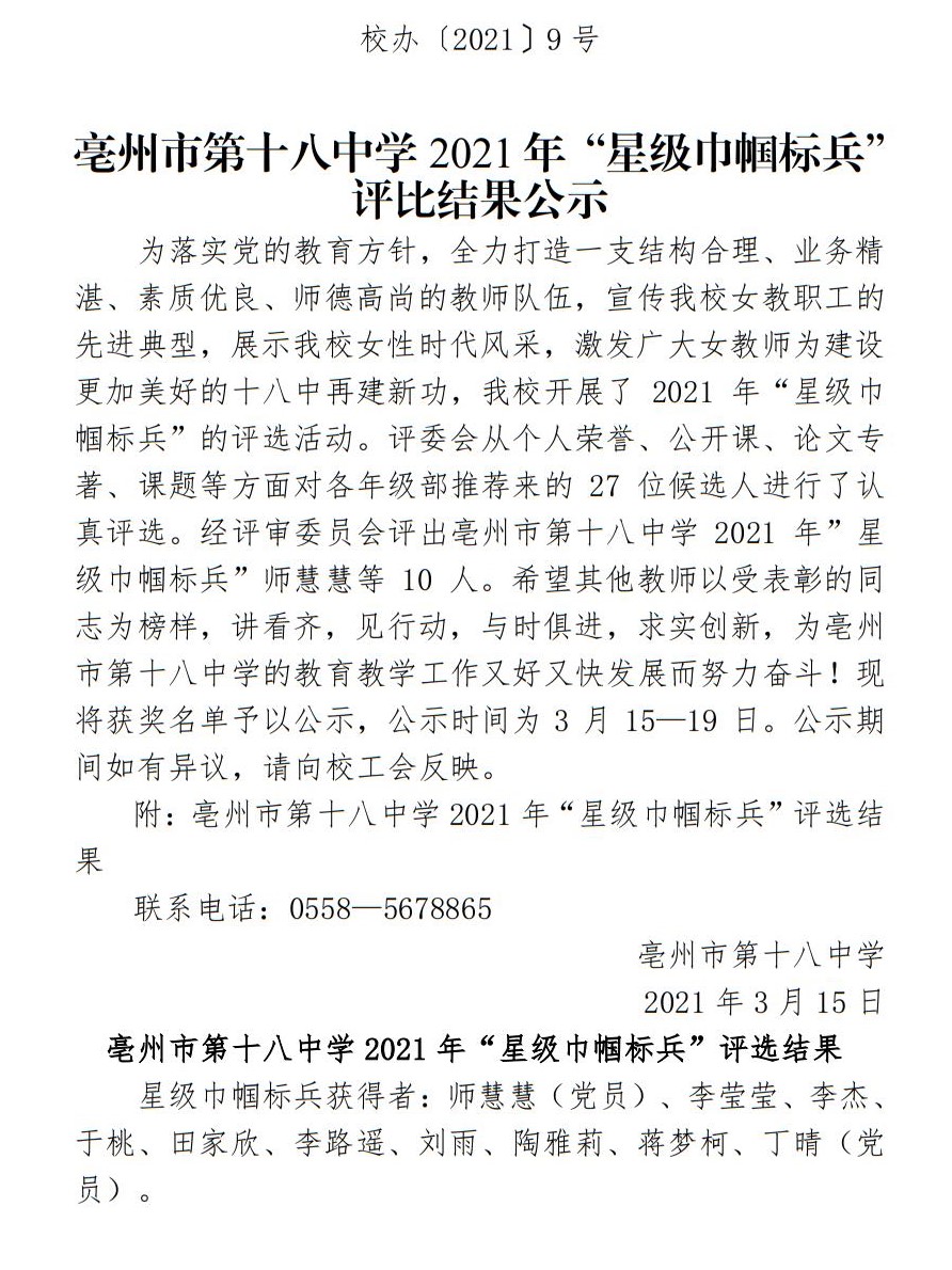 亳州市第十八中学2021年“星级巾帼标兵”评比结果公示