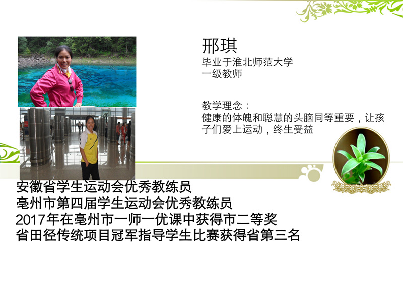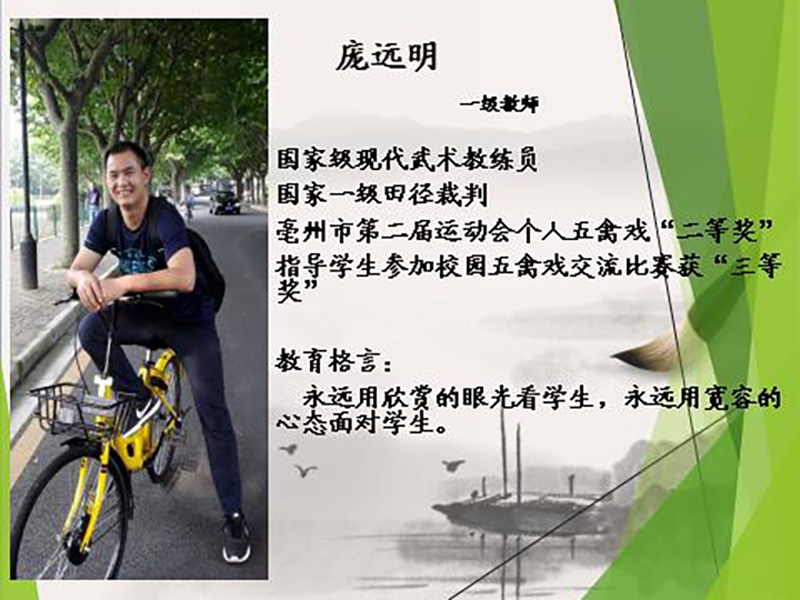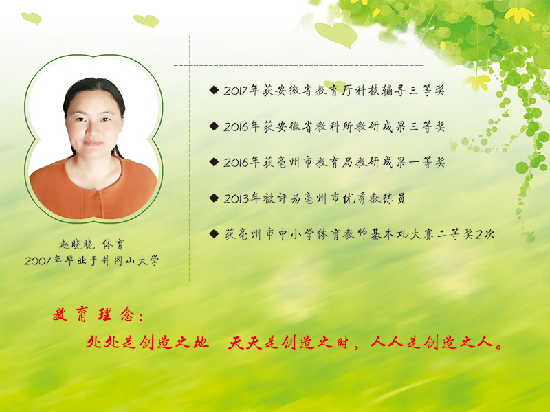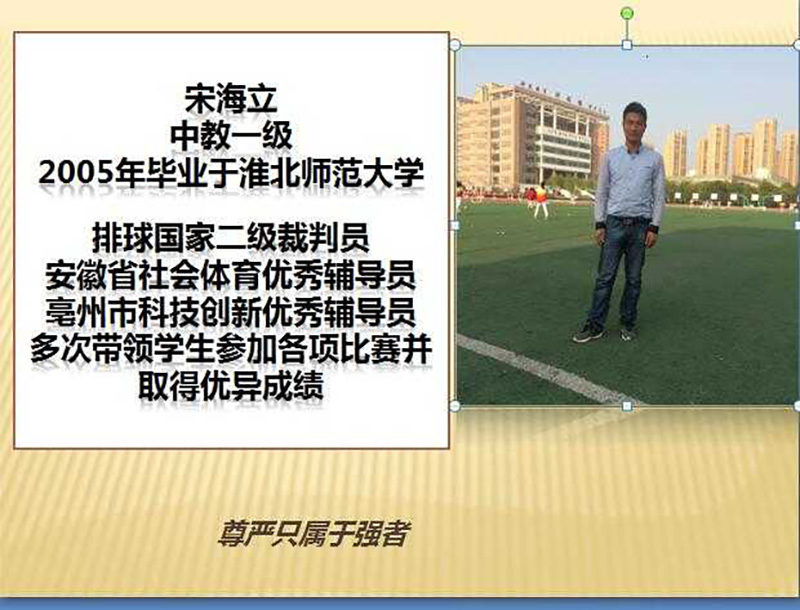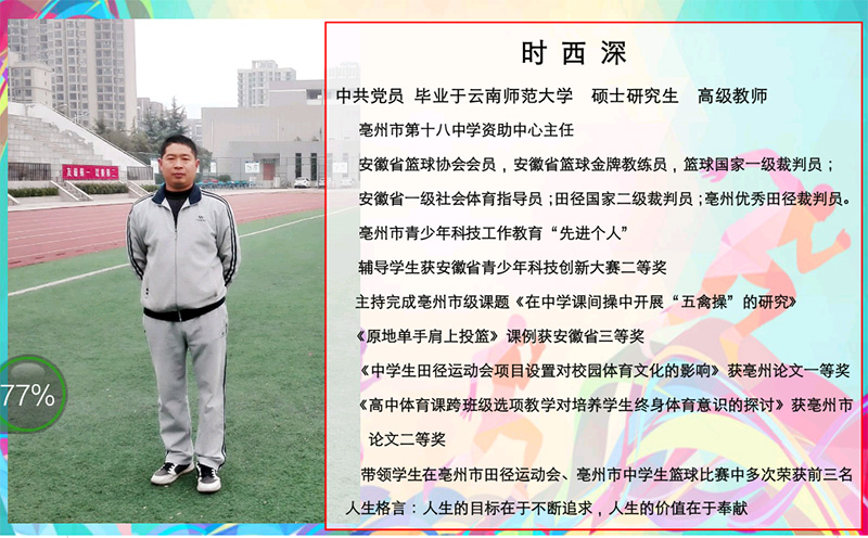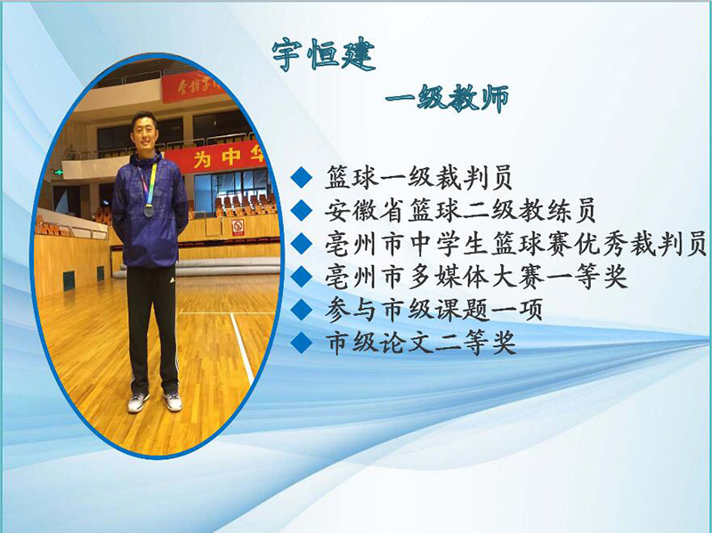 亳州十八中体育教研组是一个富有活力、团结奋进、业务精良的教师团队。本组现有13名教师,其中中学高级教师4名,中学一级教师8名,中学二级教师1名,其中中国共产党党员7人,硕士研究生2人,国家级一等奖1人,省级二等奖2人,国家一级裁判3人,国家级教练员1人,省级教练员2人,组内教师在体育教学过程中积极创新,主动有效地开展了各种学生体育活动,充分照顾到学生的兴趣爱好和满足学生的需要,本着“一切为了学生”的理念,注重学生身心发展,培养终身体育意识,养成自主健身习惯。