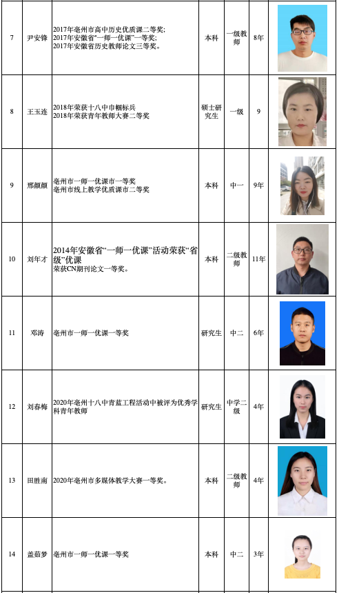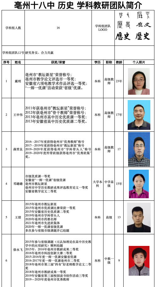 亳州十八中历史教研组现有16名教师,其中中学高级教师5人,一级教师4人,亳州市教坛新星5人,学科带头人2人,亳州市优质课大赛一等奖3人,亳州市多媒体课件大赛一等奖1人,安徽省历史优质课大赛2人,多篇论文发在省、市级教育教学论文、案例比赛中获奖。十八中历史教研组秉承亳州十八中“勤实细严、追求卓越”的校风校训,为了一个共同的教育梦想相聚在此。他们具有扎实的业务功底,治学严谨,教育教学气氛浓厚;在教学活动中,教师们坚持遵循历史学科的特点和规律,采用科学合理的教学模式和方法、手段,收到显著的效果。