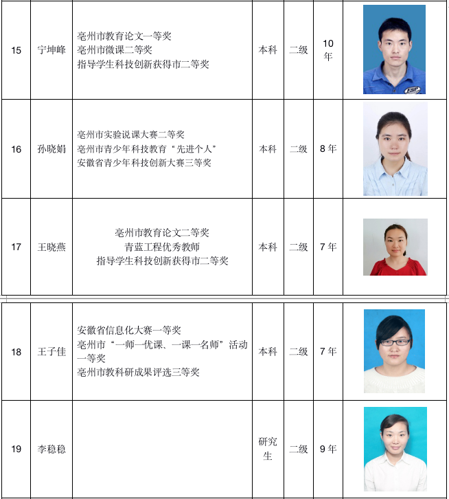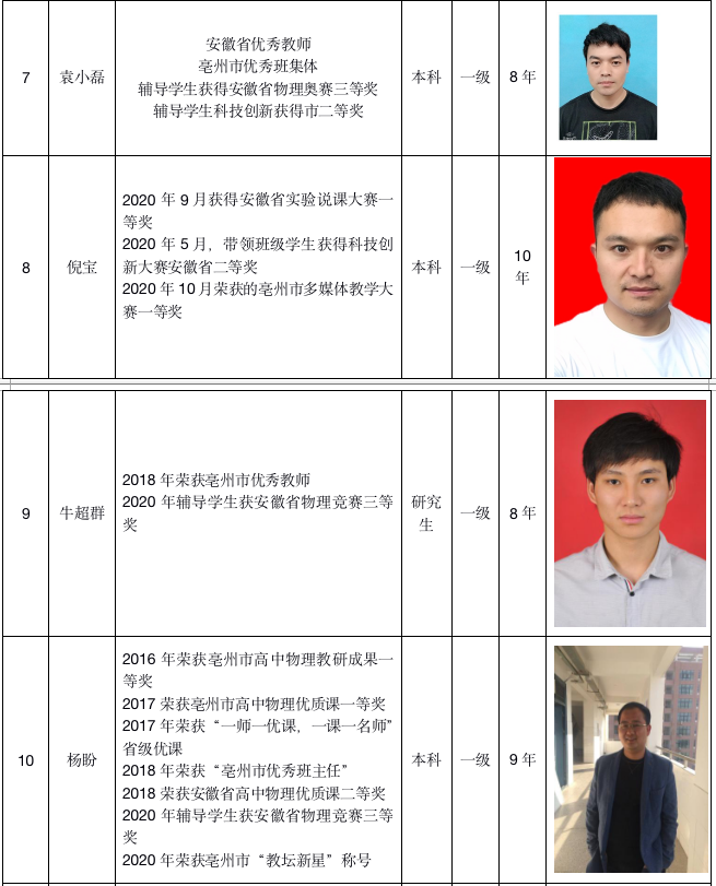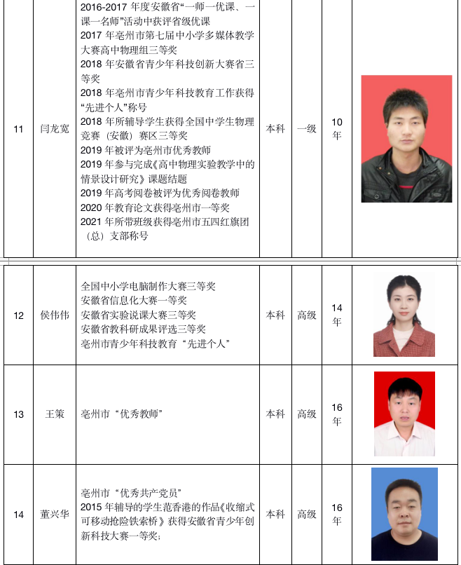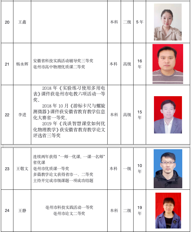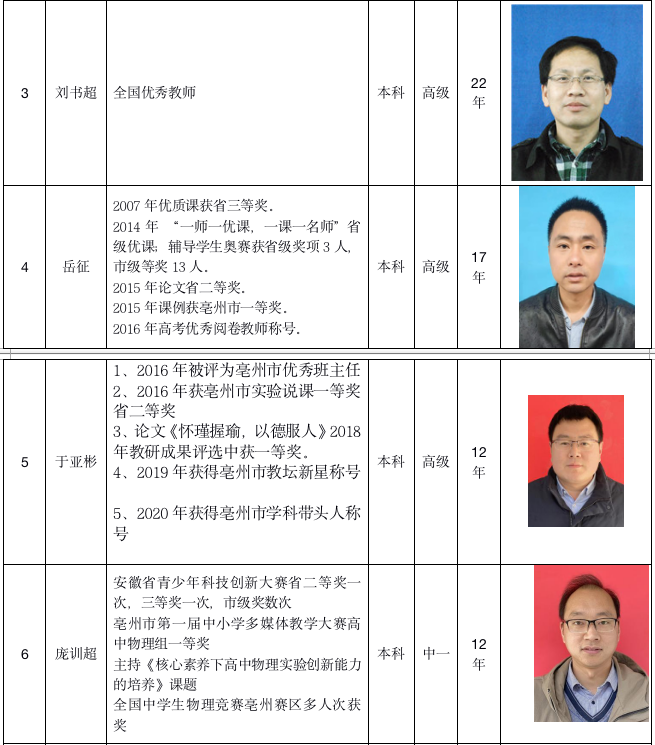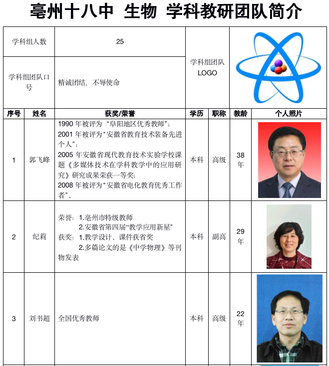 物理教研组是一支敬业、乐业、专业的物理教学团队,现有教师25人,其中副高级教师1人,国家级优秀教师1人,高级教师10人,亳州市学科带头人1人,亳州市优秀班主任3人,亳州市优秀教师4人,教坛新星2人。