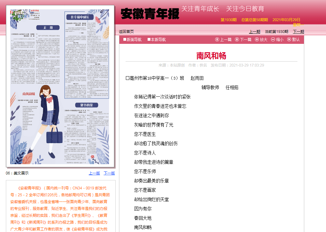 从此,您带我走进诗的篇章,带我欣赏一篇又一篇佳作,有时候还把自己的大作让我学习。而课堂上,您对诗歌的讲解,您的倾情朗诵,都让我深深沉醉其中。我对诗歌的热爱与日俱增,慢慢也开始大胆进行创作。每当我上交一篇作品,您都会一遍一遍地细读,不断改正我的问题,并告诉我为何这样改动。无论在班级里还是课堂外,您都不断地鼓励着我、指引着我,让我找到了自己的方向,并不断进步,一步一步迈进诗歌的神奇世界。在您的帮助下,我创作诗歌的热情不断高涨,慢慢也找到了些许感觉,不知不觉间取得了一些足以让自己欣喜的成绩——几首诗歌作品先后发表于《安徽青年报·学生周刊》《亳州晚报》,还有一篇获得了叶圣陶杯全国中学生新作文大赛优胜奖。成绩虽然微不足道,但诗歌的创作却让我拥有了足够的自信,让我敢于面对人生道路上的一切风雨。