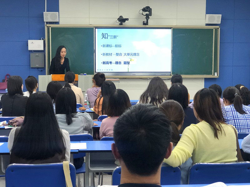 活动第三项议程是由高二英语备课组长甘流雨老师做《知行合一应“三新”》讲座。她说,三新改革背景下,新课标是引领教学的航标,要始终不偏离,新教材使用时要基于大单元概念注重整合,新高考下的备考要求教师要及时、尽早更新理念。她还提醒老师们要“知学生”,在“听、说、读、看、写”等技能和教学策略上指导、帮助、督促学生。三新改革下教师要努力学习、深入学习并坚持高质量、针对性的集体教研。