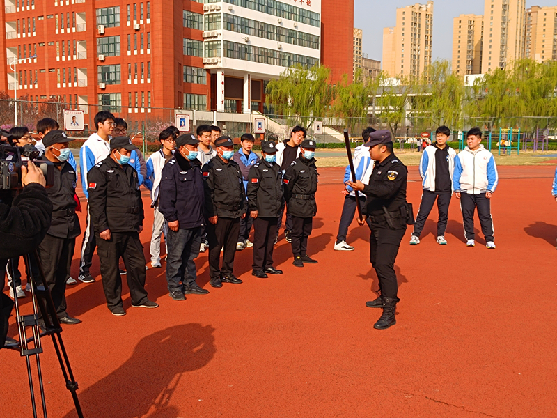在学校操场的现场演示活动中,学校保安人员也加入了进来。高新公安分局的李警官为大家教授了警棍、盾牌、抓捕器等器具的使用方法,并邀请现场人员进行了展示。