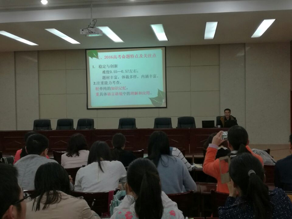 谢老师以《高考备考方向》为主题,介绍了2016高考命题特点,然后着重分享了高三后期复习备考建议,谢老师以朴实幽默的语言,从词汇、语法复习的注意事项到语法填空、短文改错、阅读理解等全国卷题型考察特点、答题策略、备考建议向大家娓娓道来,让与会老师受益匪浅。他在强调作文卷面的重要性时说“字好不一定高分,但高分一定字好”,获得与会教师的一致赞同和热烈掌声。与会老师就教育教学实践中遇到的问题和疑惑,南北校教研情况和谢老师进行了深入的交流。最后,梁校长进行会议总结并要求全体与会老师要把今天所听所学认真领悟并应用到教学实践中。