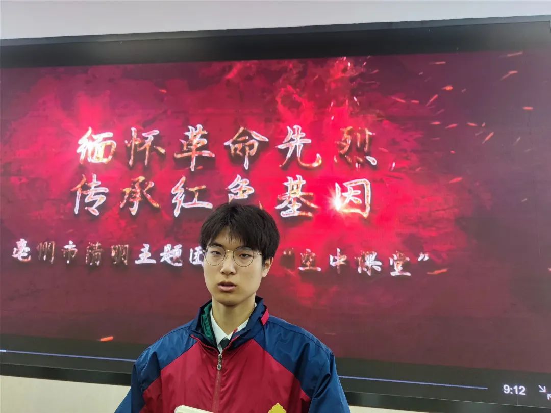 “英烈精神如同熊熊燃烧的火炬,始终照亮我们前行的道路。作为一名入团积极分子,我们应该缅怀革命先烈,弘扬中华民族的优良传统,不忘初心,不负韶华,努力学习,报效伟大的祖国”,高一15班张祝贺同学这样说道。