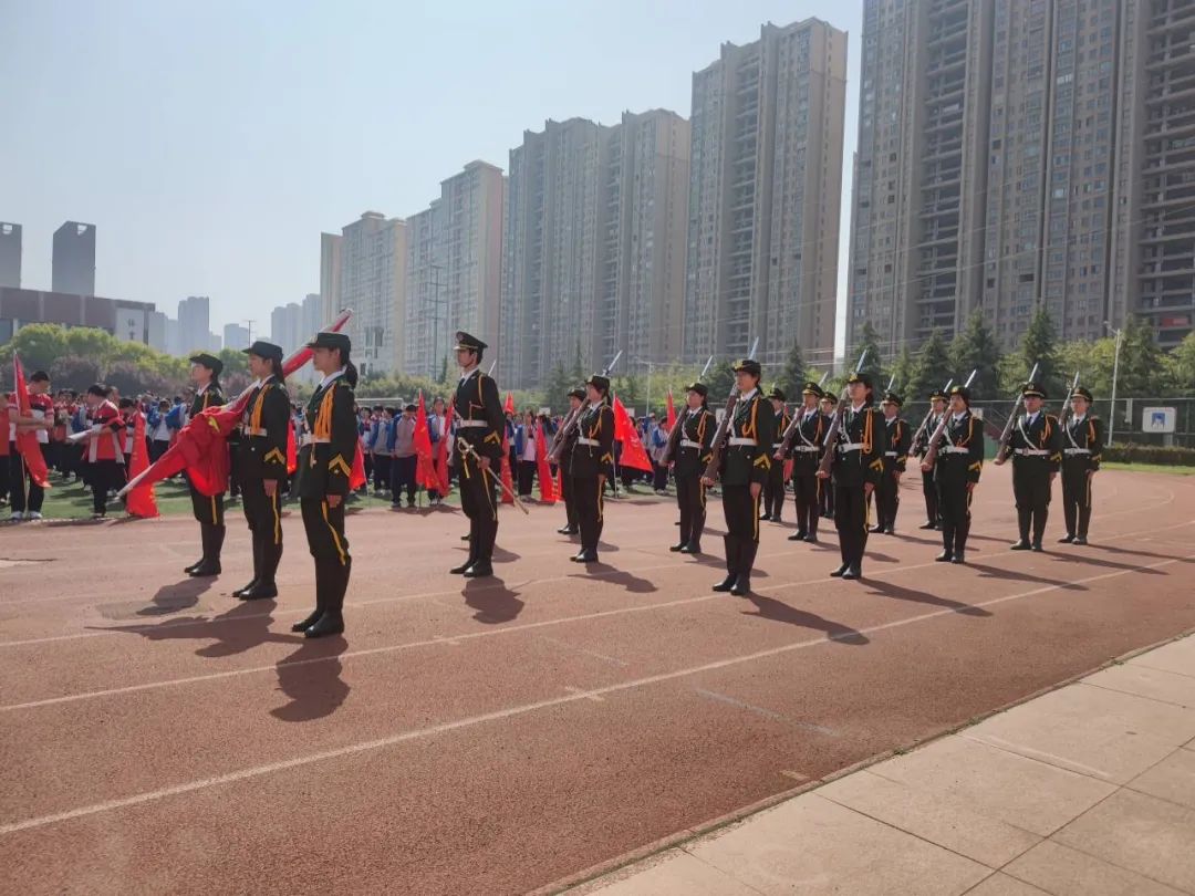 伴随着雄壮嘹亮的国歌声,升旗手将国旗用力一挥,鲜艳的五星红旗迎着朝阳冉冉升起,在柔和的微风中飘拂,全体师生整齐肃立,齐唱国歌,向国旗行注目礼。