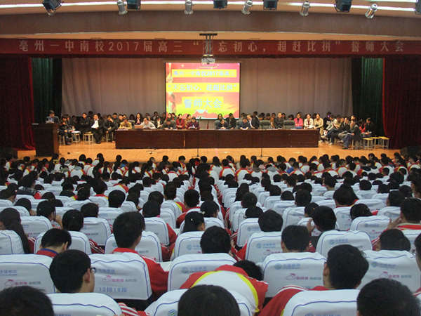 10月24日,亳州一中南校高三全体师生齐聚我校至美厅,隆重举行2017届高三“不忘初心,赶超比拼”高三动员誓师大会。此次会议由总督学郭飞峰主持。副校长马坤、梁彩霞,教导处主任戴永兴,政教处主任何立宏,后勤主任胡达高三年级部部长张震等出席会议。
