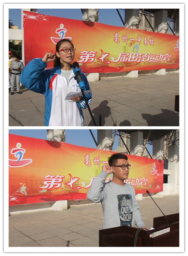 运动员代表尹婉莹和裁判代表姜进分别代表运动员们和裁判们庄严宣誓。随着陈亮局长掷地有声的“我宣布亳州一中南校第七届田径运动会正式开幕!”,本次运动会正式拉开帷幕。