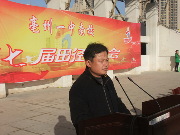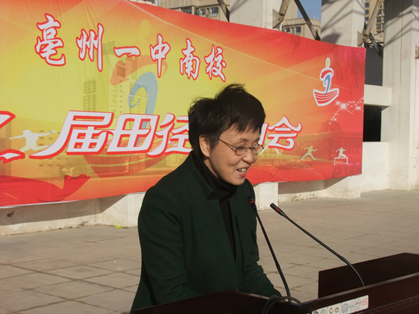 在迎风飘扬的五星红旗下,亳州一中南校校长宋耘为本次开幕式致辞。她代表学校向运动会的胜利举行表示热烈的祝贺!向长期以来关心和支持学校工作的各级领导和社会各界人士表示衷心的感谢并致以崇高的敬意!向为本届运动会的顺利召开洒下辛勤汗水的老师们表示衷心的谢意!向刻苦训练、备战校运会的同学们表示亲切的慰问!宋耘校长充分阐释了运动对于生命的意义,希望并要求全体参赛运动员发扬“更快、更高、更强”和“团结、友谊、进步”的奥林匹克精神,遵守比赛规则,团结协作,顽强拼搏,胜不骄,败不馁,赛出风格、赛出水平,赛出友谊,全面展现一中南校学生蓬勃向上的精神风貌,取得运动成绩与精神文明双丰收;希望全体裁判员、工作人员坚持公开、公平、公正的原则,恪尽职守,严于律己,严肃赛风,严格赛纪,确保运动会的顺利进行。