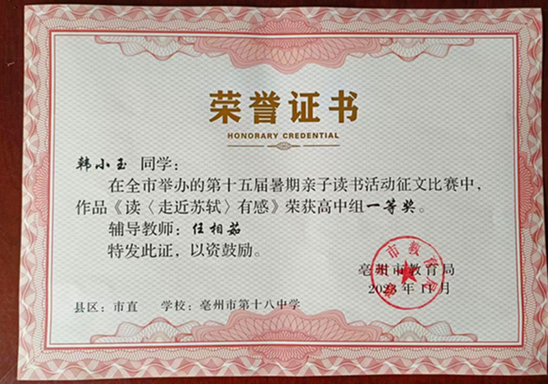 亳州十八中一直以来十分重视书香校园建设,积极推进校园读书活动。学校工会每年都组织全校师生参加暑期亲子读书征文活动,并多次获得优秀组织奖。校园读书活动的开展,提升了学生的文学素养,助力了学生综合素质的全面发展。(供稿:于小龙 编辑:于 桃 审核:王素云)