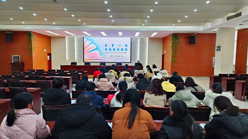 12月26日,亳州十八中语文教研组在学校至真厅开展“分享一次专业成长经历”专题教研活动,活动由优秀教师叶金主讲,教研组组长刘莺鸽主持,全校语文教师参加活动。