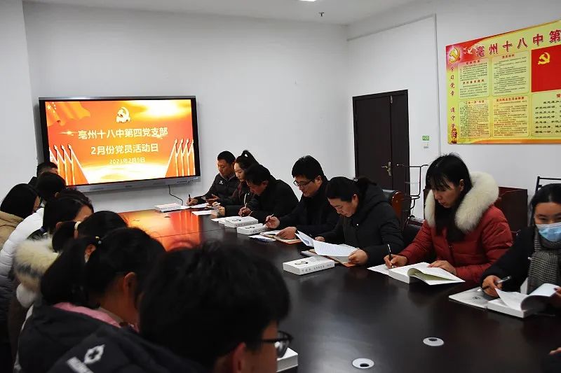 2月9日,亳州十八中第四支部开展党员活动日,活动围绕提升理论素养,加强党性锻炼,发挥模范作用等主题展开。活动由支部书记庞永主持,校党委书记、校长李俊参加了本支部活动。