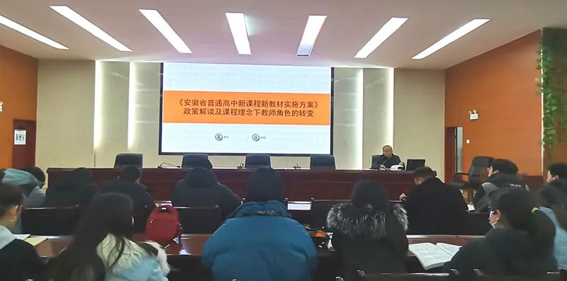 孙德兴首先对《安徽省普通高中新课程新教材实施方案》进行了政策解读,强调了课程实施与评价的主要措施。他要求年级要认真做好学校课程规划,加强学校课程管理,有序推进选课走班,深化课堂教学改革,加强学生发展指导,完善考试评价制度。他对《安徽省高考综合改革实施方案》中的“完善普通高中学业水平考试制度、深化高考考试科目改革及实施综合素质评价制度”等任务进行了解读。他指出教师在“新课程、新教材、新高考”理念下转变角色,教学要坚持素养导向,强化学科实践,大力推进课堂教学改革,积极探索基于情境、问题导向的体验式、参与式、启发式、探究式等课堂教学。