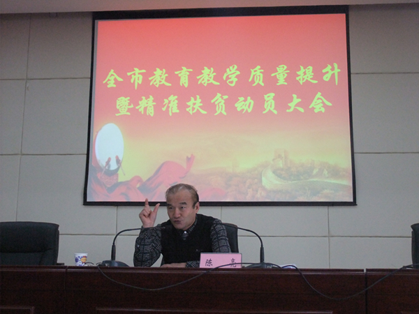 陈亮从我市教育现状出发,要求大家树立目标意识,努力将常规教学做到极致,向身边的优秀同事学习,查找自身不足并及时提高,全心全意投入到教育教育的研究和实践之中。他还阐释了教育扶贫工作的重大意义,提出了满足扶贫工作的一切需要,坚持奋斗到底等七点要求,并号召全体教育人一道努力拼搏、真抓实干,奋力走在皖北教育的前列。陈亮掷地有声的话语感染了在座的每一位听众,他的发言为我市今后的教育教学质量提升和教育扶贫工作指明了方向,也为每一位与会人员鼓足了干劲。