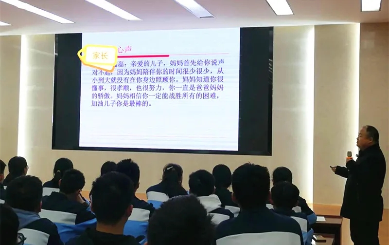 共心共育待花开,感恩教育育人心。这次班会课上,王金还设置了感人的“家长的心声”环节,家长对孩子表达自己的情感和期望,学生用心感受父母的话语。班级学生热泪盈眶,沉浸式感受父母的爱与呵护,感知爱、拥抱爱、实现爱,变感动为行动,让行动成习惯。