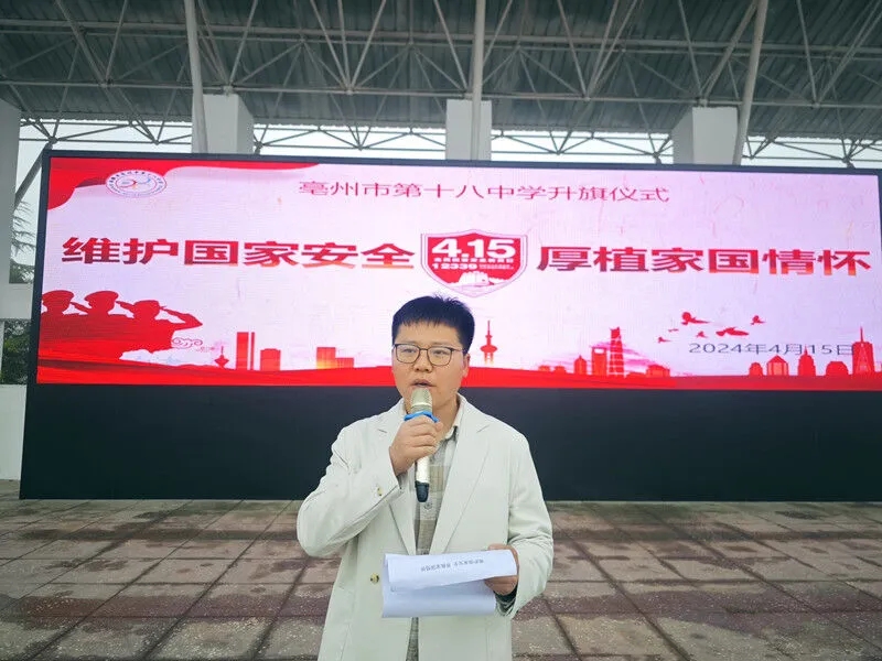 4月15日清晨,亳州十八中在操场举行“维护国家安全,厚植家国情怀”主题升旗仪式。仪式由叶金老师与七年级(8)班的王依玲同学共同主持。