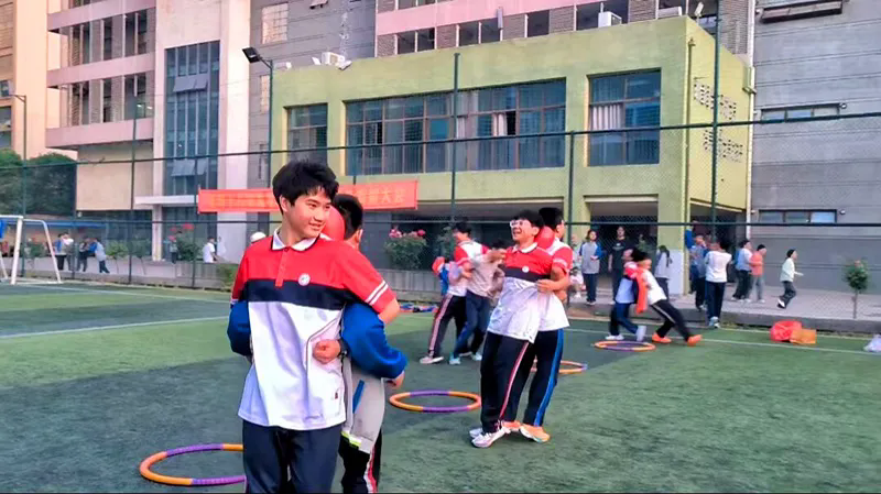 按照规则两位同学背靠背夹住气球,步调一致,以最快的速度绕过前面地面的呼啦圈,跑回方队,将气球传递给下一组学生。观看的同学为参加比赛的同学加油助威。在一阵阵加油声中,每组参赛的同学都铆足了劲往前跑。