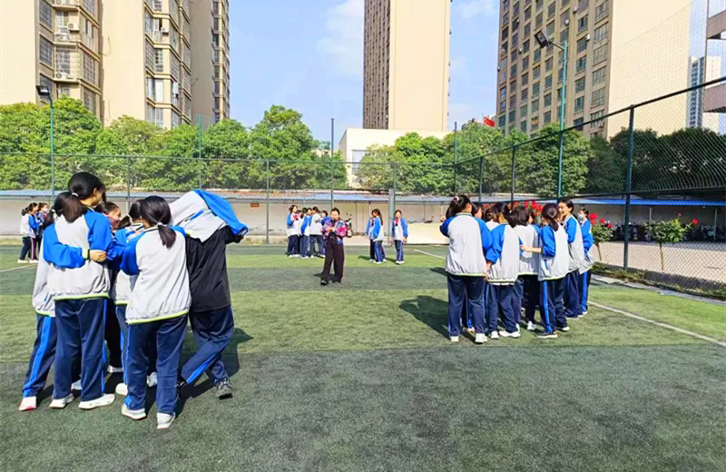 同学们手拉手围成一个大圆圈,跟着音乐的节奏摇摆,随着老师的指令绽放出一朵朵更大的桃花。在欢声笑语中,学生们的压力与烦恼瞬间化为乌有。
