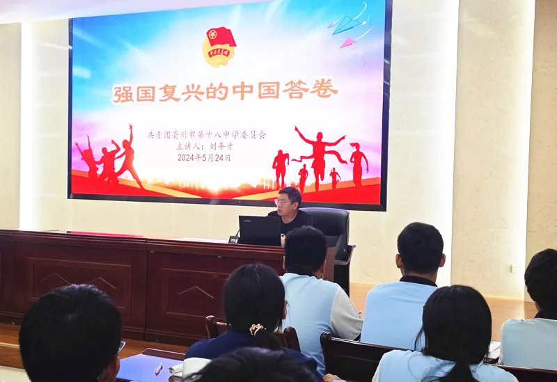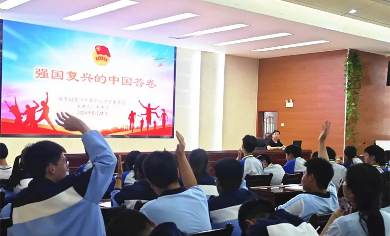 为深入学习贯彻习近平新时代中国特色社会主义思想,推动强国复兴伟大战略的实施,5月24日下午,亳州十八中在至真厅开展了以“强国复兴的中国答卷”为主题的团课。会议由校团委刘年才老师主讲,全体入团积极分子参与了本次会议。