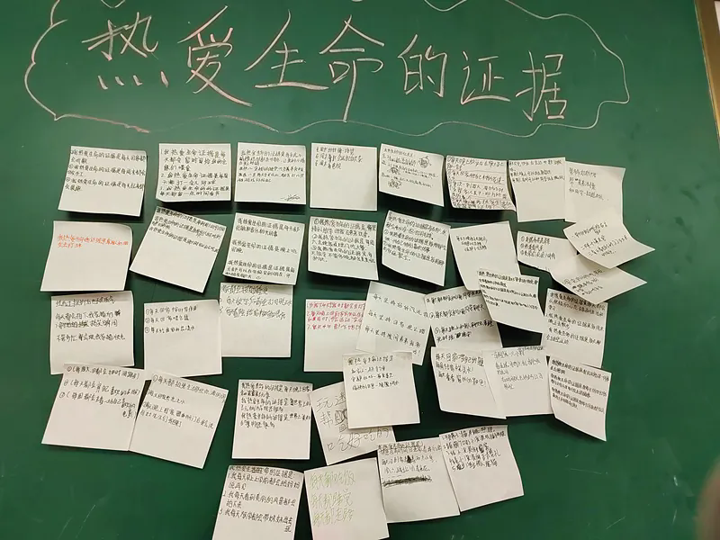李艳梅老师在七年级上了《尊重生命 热爱生命》,课堂以学生体验、师生互动的形式开展,学生在便利贴上写了热爱生命的心声,并张贴在黑板上,这样有仪式感的教育形式,使学生感受深刻。八年级学生一起观看心理电影《靴猫的最后一条命》,通过写观后感的形式教育学生“珍惜生命,关注当下幸福”。