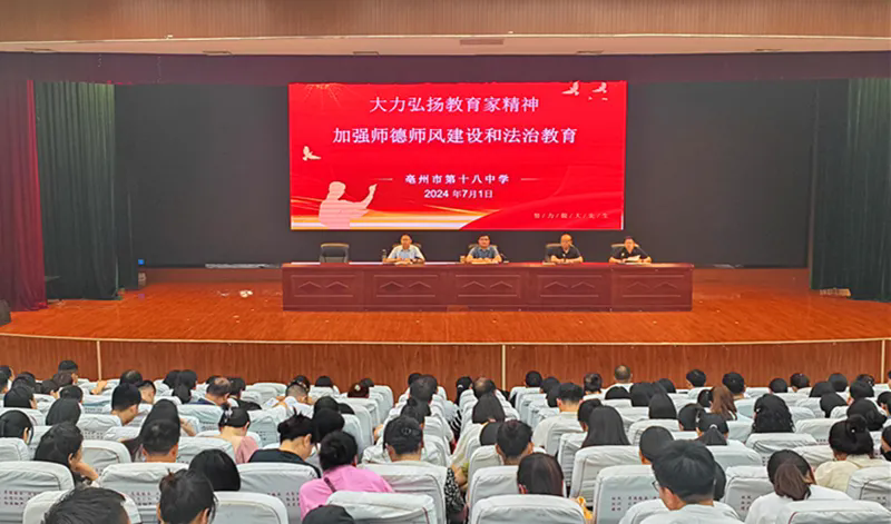 7月1日,亳州十八中召开师德师风教育专题大会,深入学习贯彻党的二十大精神和习近平总书记关于大力弘扬教育家精神的指示要求,进一步打造优质教育环境,加强教师的法治教育。