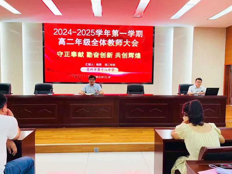 8月31日,亳州十八中高二年级召开全体教师会议,筹划新学期教学教研工作。会议由高二年级主任陈思主持,校长李俊出席会议并讲话。