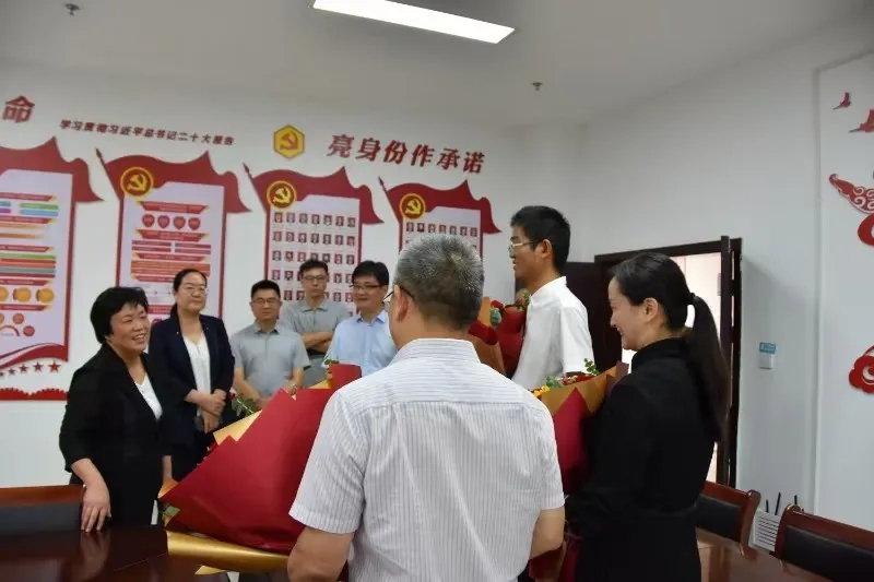 曹振萍来到第一会议室,为田先仁、高楠、李万月三位优秀教师代表送上鲜花和慰问金,并向他们和全体教职工致以节日的问候。曹振萍详细了解了亳州十八中教育教学、师资力量等情况,勉励大家要大力弘扬教育家精神,胸怀天下、乐教爱生,努力承担起为党育人、为国育才的光荣使命,争做新时代“大先生”。