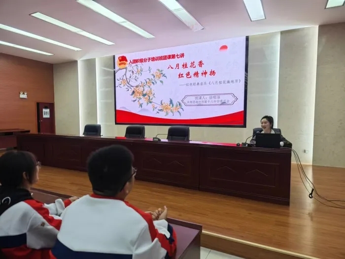 10月31日,亳州十八中在至真厅举办了一场别开生面的团课活动,主题为“八月桂花香,红色精神扬”,以经典红色歌曲《八月桂花遍地开》为核心内容,引领学生们追寻红色足迹,了解革命历史,传承革命精神,激发爱国情怀。本次团课由校团委副书记徐明菲主讲,全体入团积极分子参加了会议。