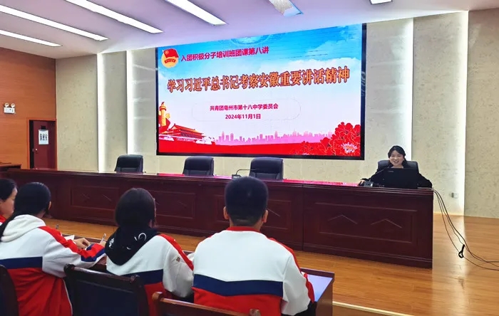 为深入贯彻党的二十大和二十届三中全会精神,深刻领会习近平总书记考察安徽时的重要讲话精神,11月1日,亳州十八中在至真厅开展深入学习贯彻习近平总书记考察安徽重要讲话精神主题团课。此次团课由校团委副书记叶金主讲,全体入团积极分子参加会议。