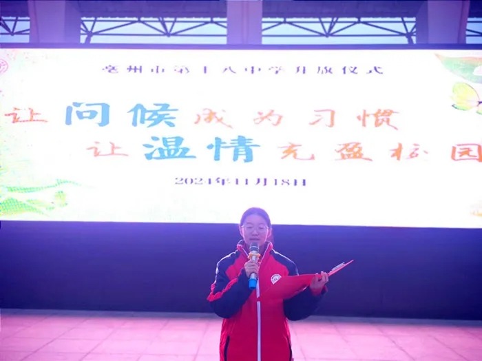 在“世界问候日”来临之际,11月18日清晨,亳州十八中举行“让问候成为习惯,让温情充满校园”主题升旗仪式。全体师生齐聚操场,共同开启充满爱与美好的一天。本次升旗仪式由叶金老师与八(4)班张懿同学主持。