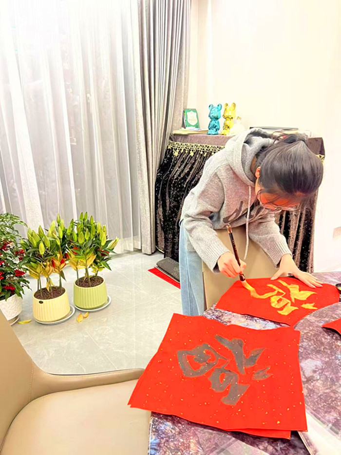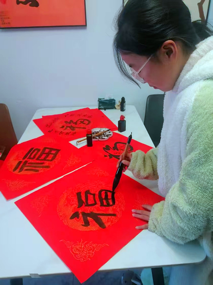 此次活动主要包含传统文化体验和文化创意作品制作两部分。爱好书法的学生,积极挥毫泼墨,一幅幅对仗工整、寓意吉祥的春联跃然纸上,墨香与年味交织,让同学们在实践中感受书法艺术的独特魅力与春联的深厚底蕴。
