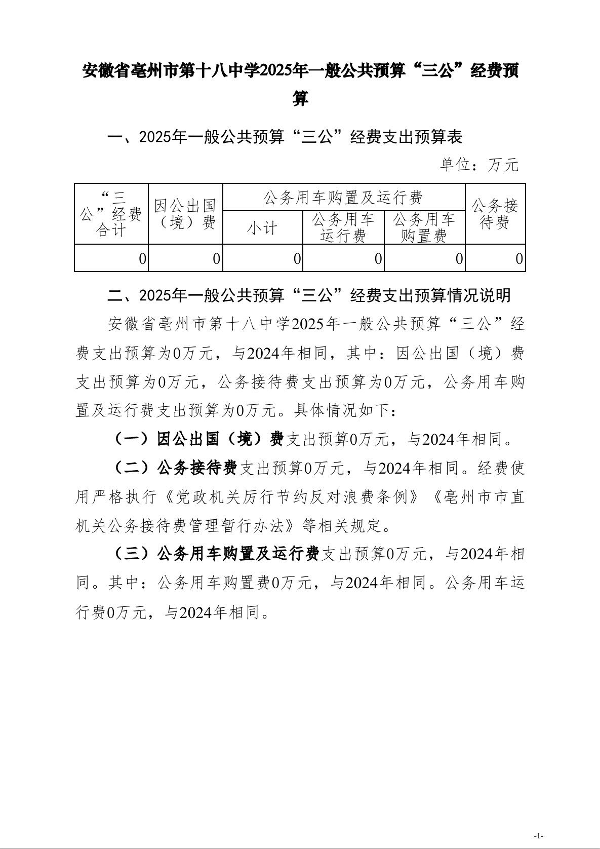 安徽省亳州市第十八中学2025年一般公共预算“三公”经费预算