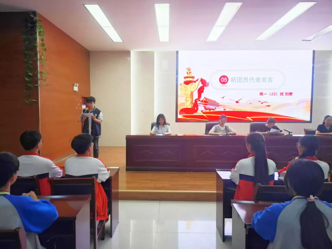 “我志愿加入中国共产主义青年团……”在领誓人九(2)班老团员贾语双的带领下,新团员面向团旗庄严宣誓。铿锵誓言响彻礼堂,彰显着新时代青年的蓬勃朝气。新团员代表高一(22)班学生刘奇在发言中分享了学习感悟:“团校学习让我们明白,共青团员不仅是荣誉,更是责任。未来将以更高标准要求自己,在学习和生活中践行青春誓言。”老团员代表高三(21)班学生赵静雅向新团员们表达了祝贺,并希望大家能够珍惜团员身份,在学习和生活中发挥模范带头作用,为团旗增光添彩。
