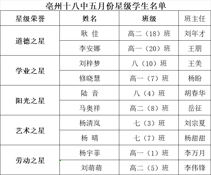 为积极践行“五育并举”教育理念,探索育人新模式,亳州十八中每月开展“星级学生”评选活动,通过树立典型、表彰先进,有效引导学生树立正确的人生观。经过层层筛选,最终确定五月份星级学生名单: