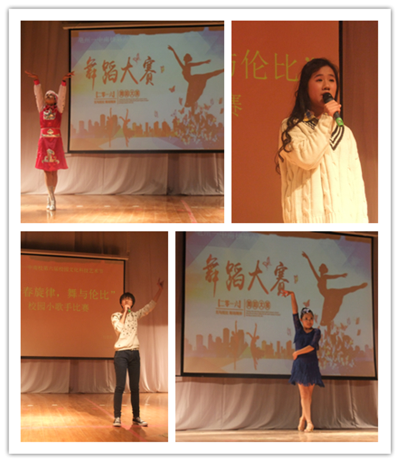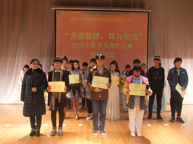 12月16日下午4:30分,亳州一中南校第六届校园文化科技艺术节系列活动之“青春旋律、舞与伦比”校园小歌手大赛及舞蹈大赛在至美厅隆重举行。经过初赛的角逐,共有14位选手进入小歌手决赛,7组选手进入舞蹈决赛,他们为全场近千名观众献上了一场歌舞盛宴。