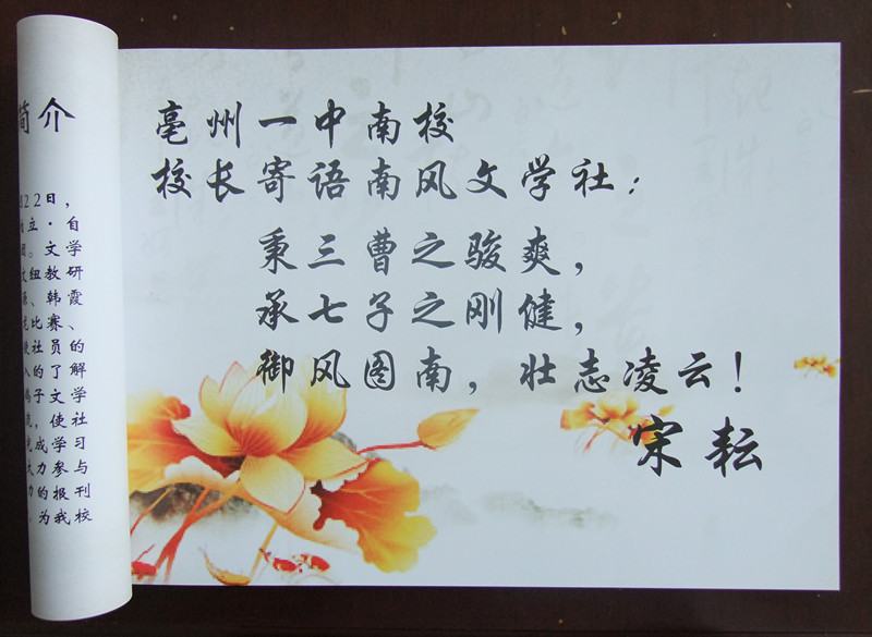 亳州一中南校校长宋耘对南风文学社的社团工作给予了充分肯定,并为文学社寄语——“秉三曹之骏爽,承七子之刚健。御风图南,壮志凌云!”该题词彰显了亳州大地浓厚的历史文化底蕴,寄托了她对文学社的厚望,给社团师生以莫大鼓舞。