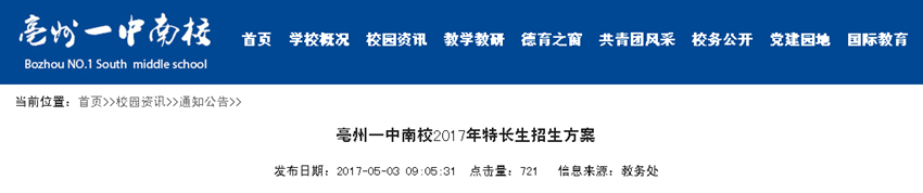 校园网上的《亳州一中南校2017年特长生招生方案》