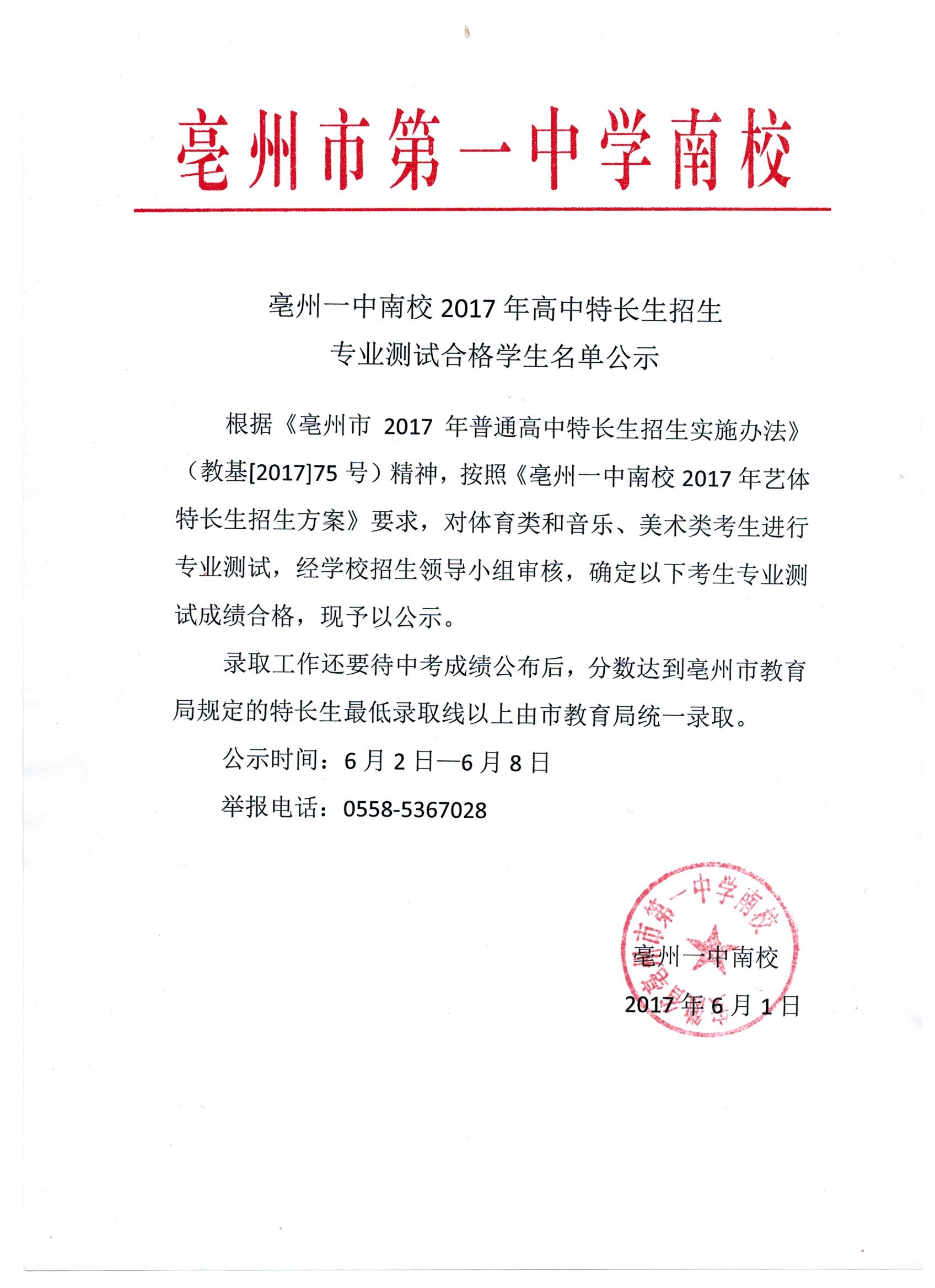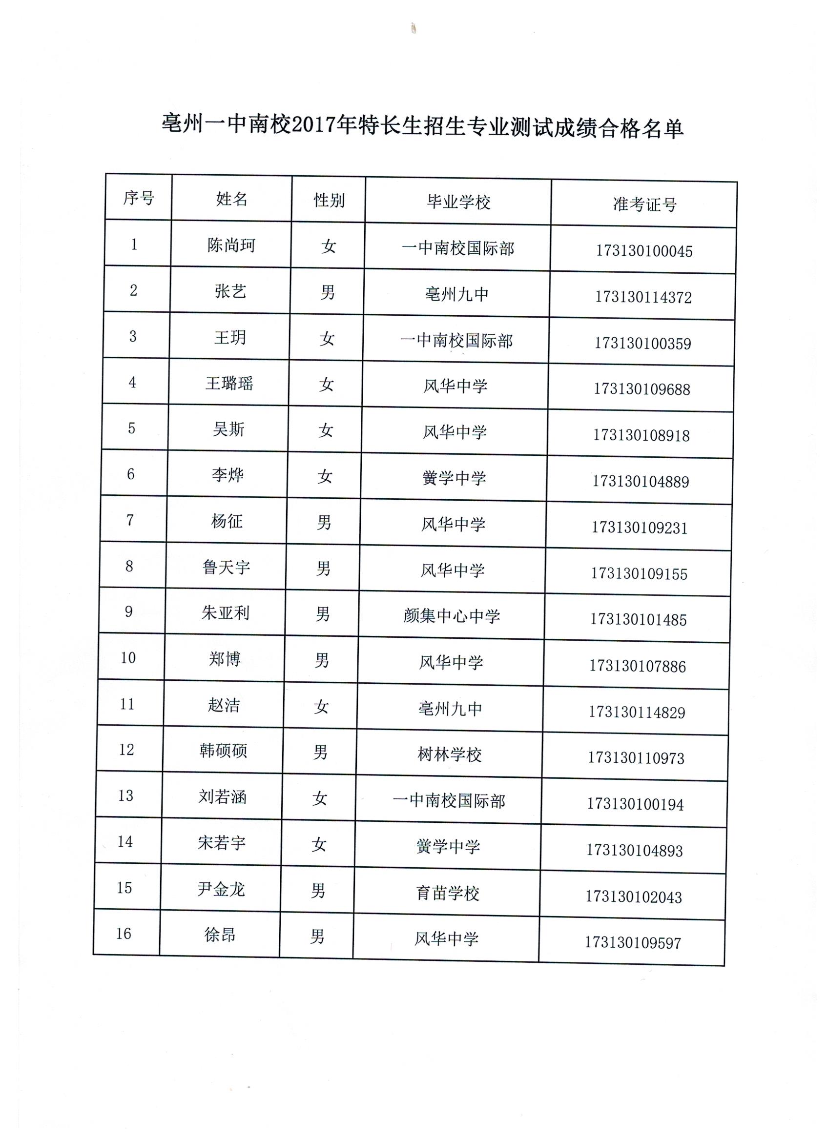 亳州一中南校2017年高中特长生招生专业测试合格学生名单公示