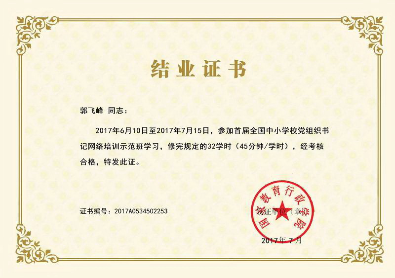 我校党总支部副书记郭飞峰参加首届全国中小学校党组织书记网络培训示范班学习取得合格证书